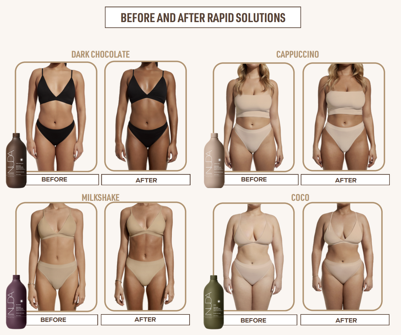 Explore Nuda’s lines of professional, self tanning, and aftercare products—including rapids, overnights, self tanning mousses, and tan extenders.